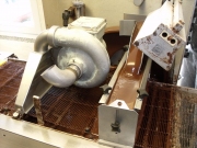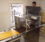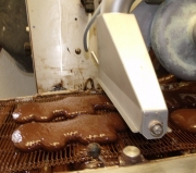 Die Pfefferkuchen werden zum überziehen auf das Gitterband gelegt. Das letzte Bild zeigt uns ein Gebläse, was die übrige Schokolade wieder vom Pfefferkuchen runter blässt. So bleibt ein schöner gleichmässiger Schokoladenüberzug. |