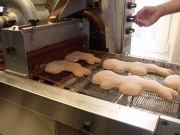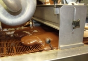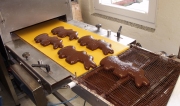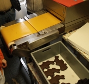 Der überzogene Pfefferkuchen wird jetzt noch durch einen 5 Meter langen Kühlkanal geschickt, so dass sich die Schokolade abkühlt und zur weiteren Verarbeitung bereit steht. |